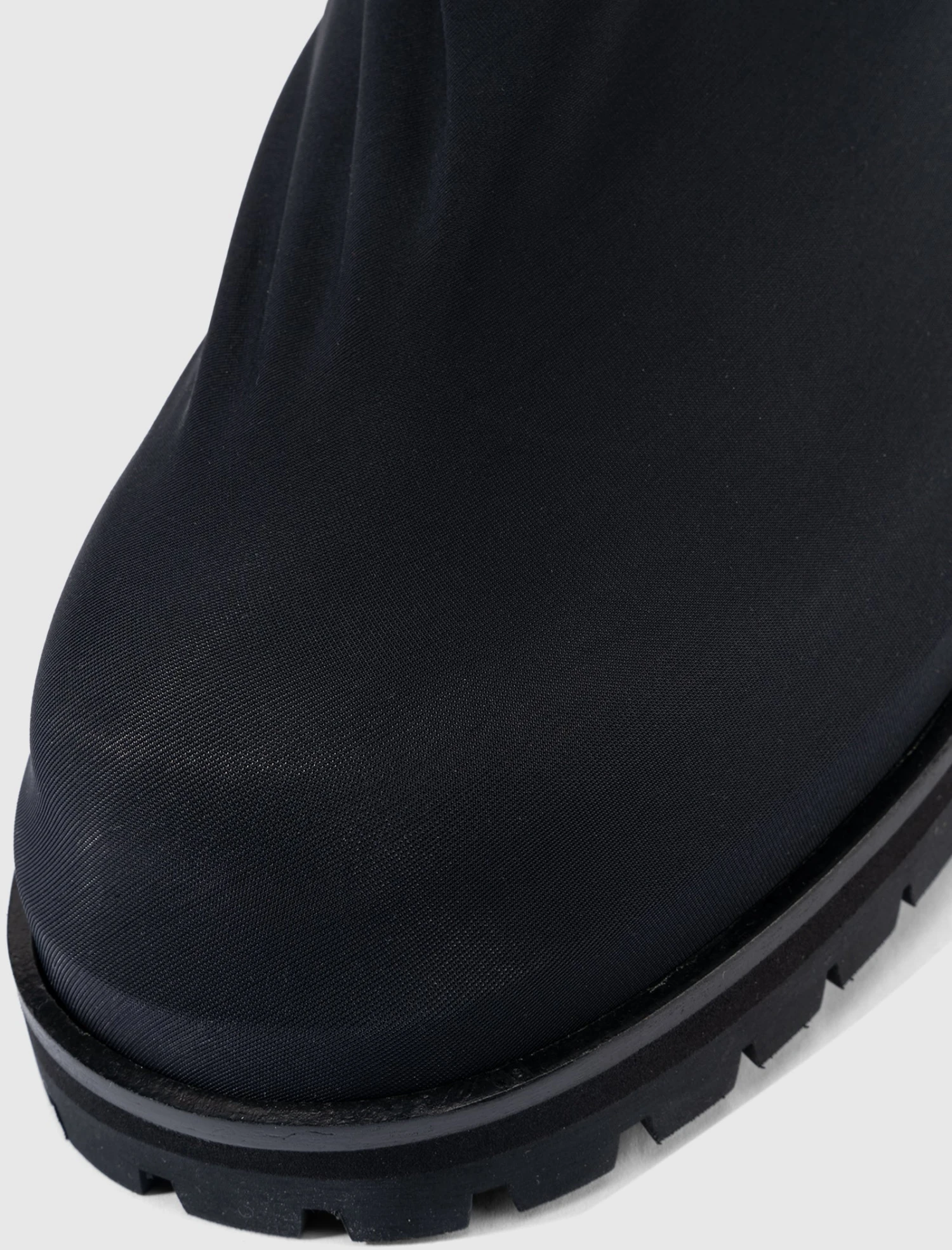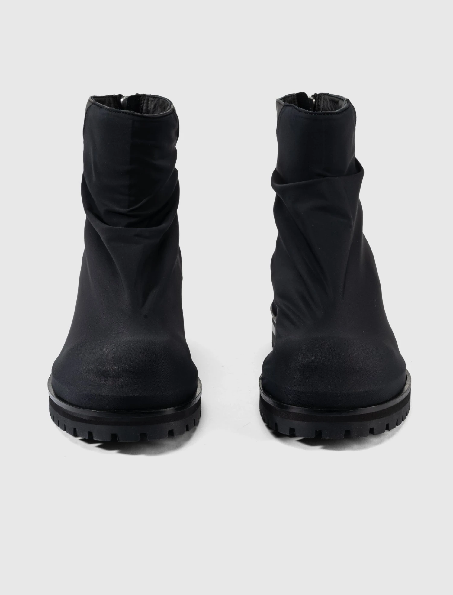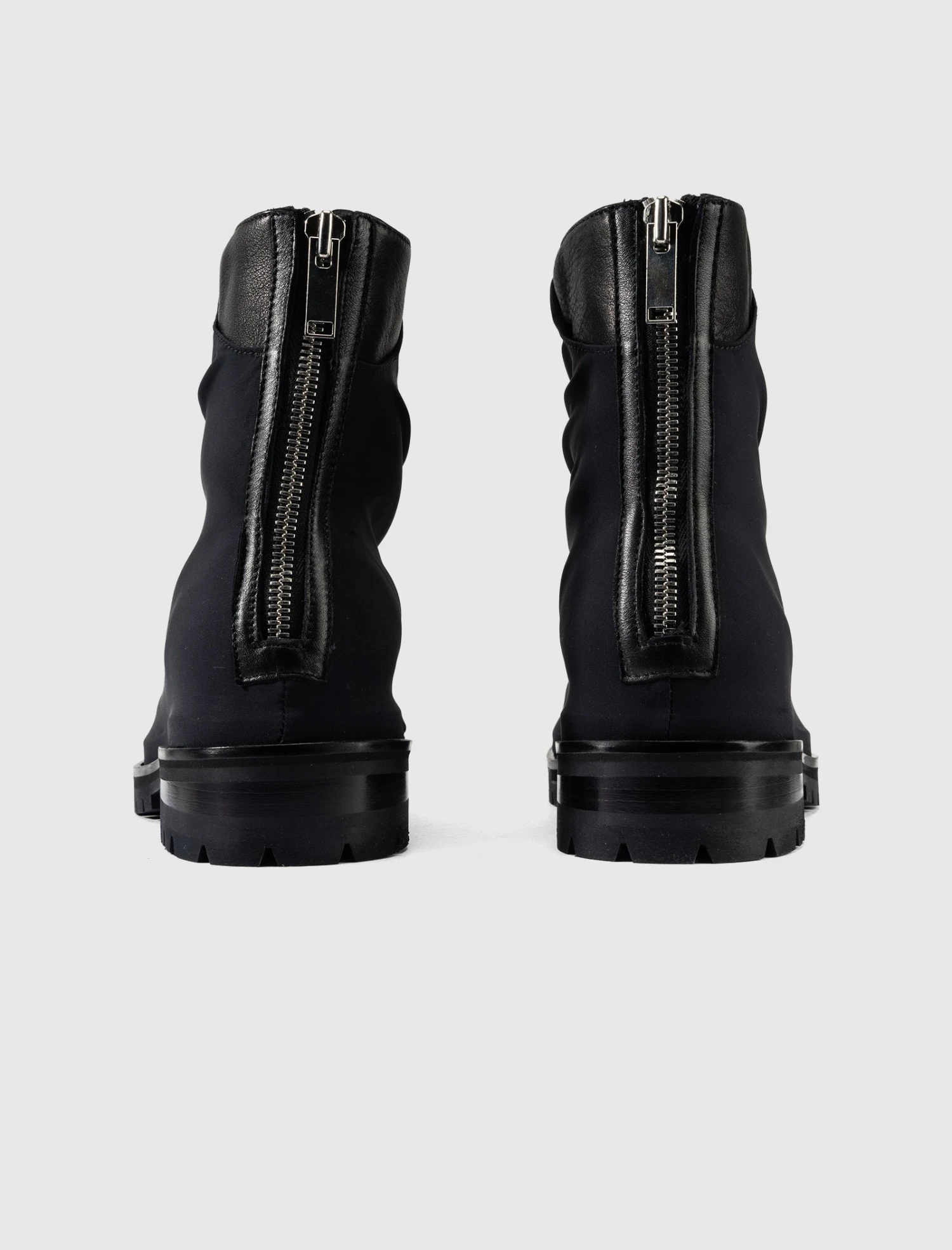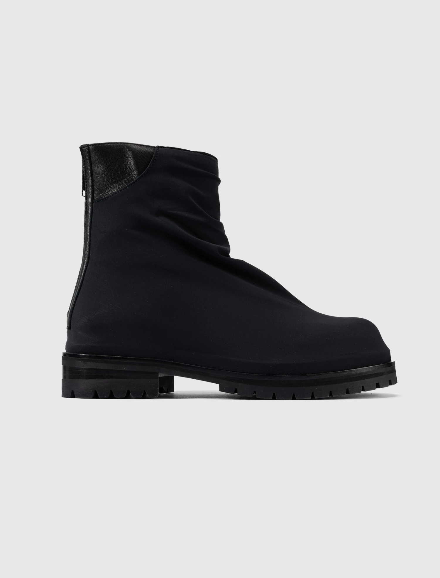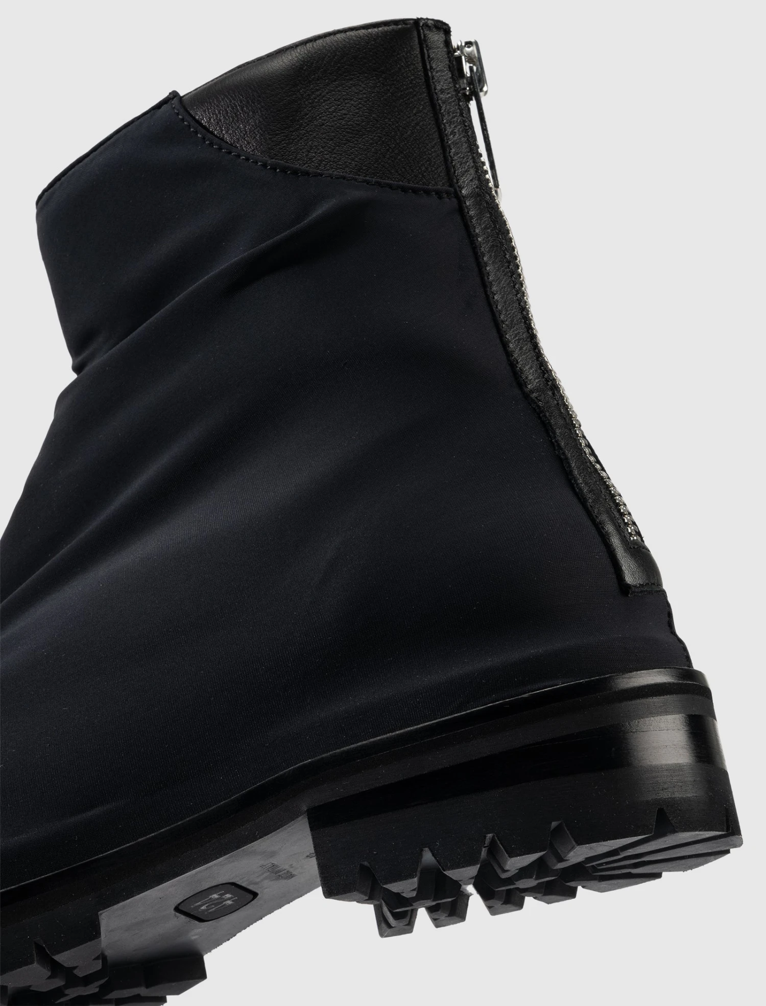Nylon ankle boots. Round toes. Contrast leather panel detailing at back. Lug sole. Zip closure at back.