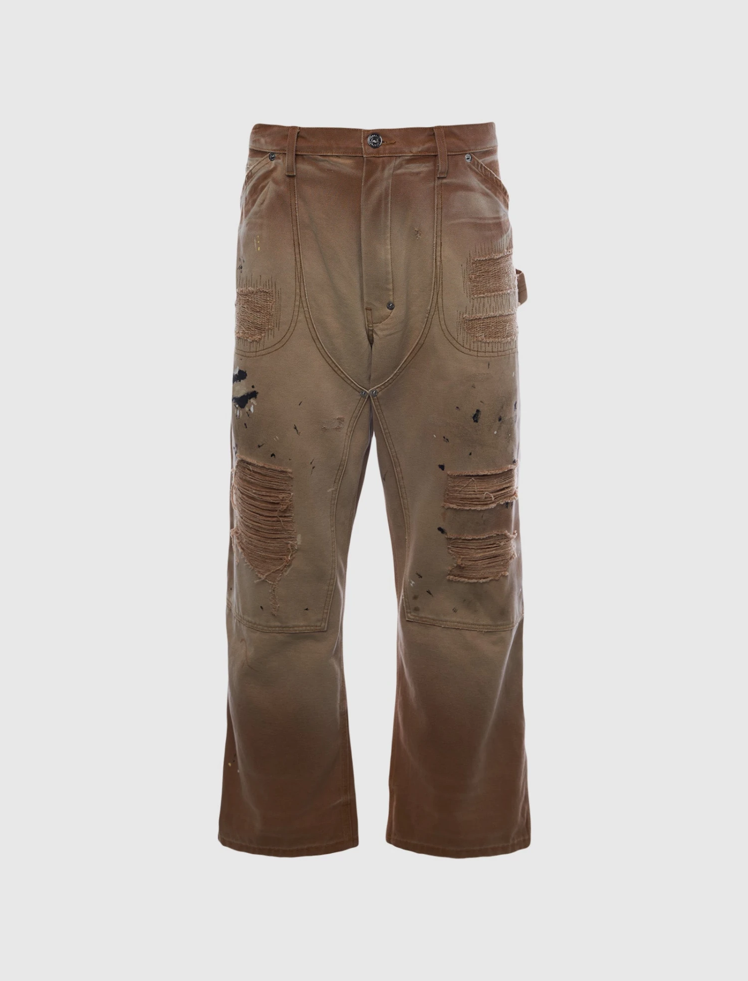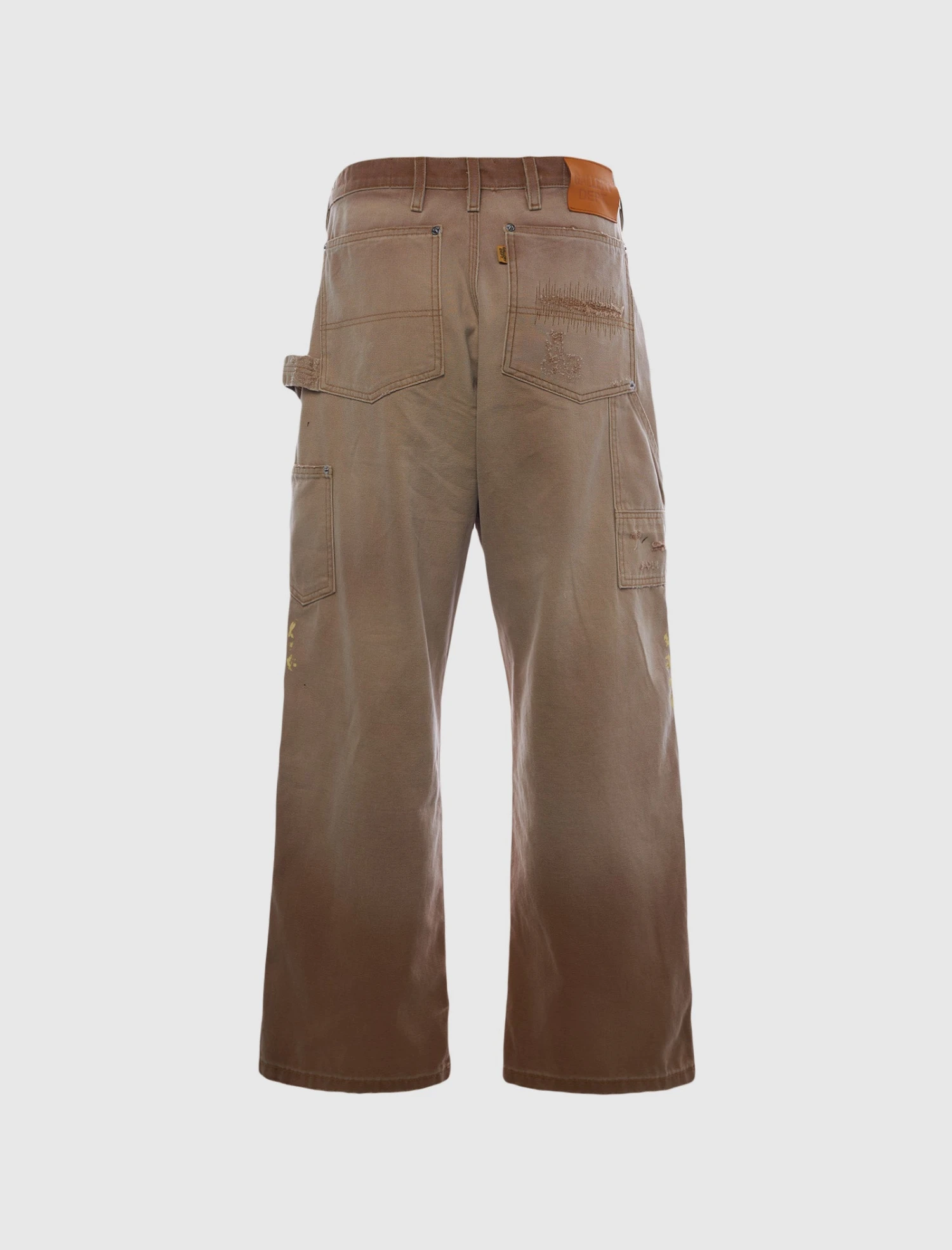 Get the ultimate carpenter pants from Gallery Dept! These slim, flared tan pants with panelled construction feature hand-painted detailing throughout and a classic five-pocket styling. Fasten with a silver-tone button-fly and show off the lightly distressed cuffs. Complete with belt loops and a leather logo patch at the waist, these pants are lovingly painted and treated in Los Angeles.