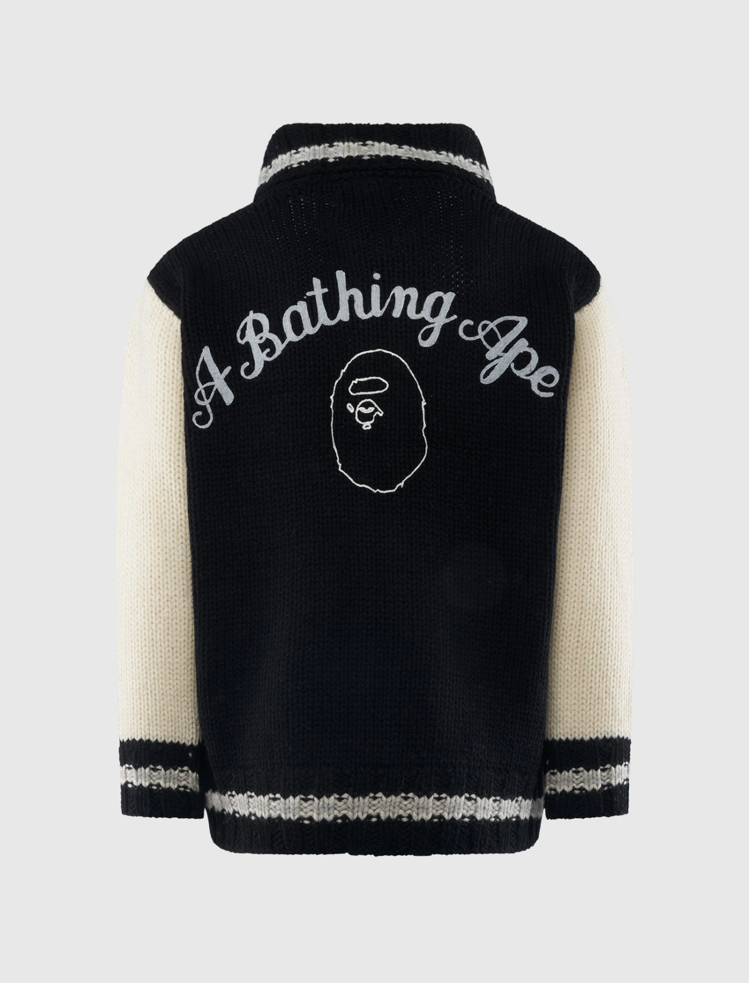 Stay cozy and stylish with the A Bathing Ape Cowichan Cardigan. Crafted from a premium knit, this black-and-off-white piece features bold branding and a timeless design. Perfect for layering, it offers comfort and street-ready flair. Elevate your wardrobe with this statement cardigan.