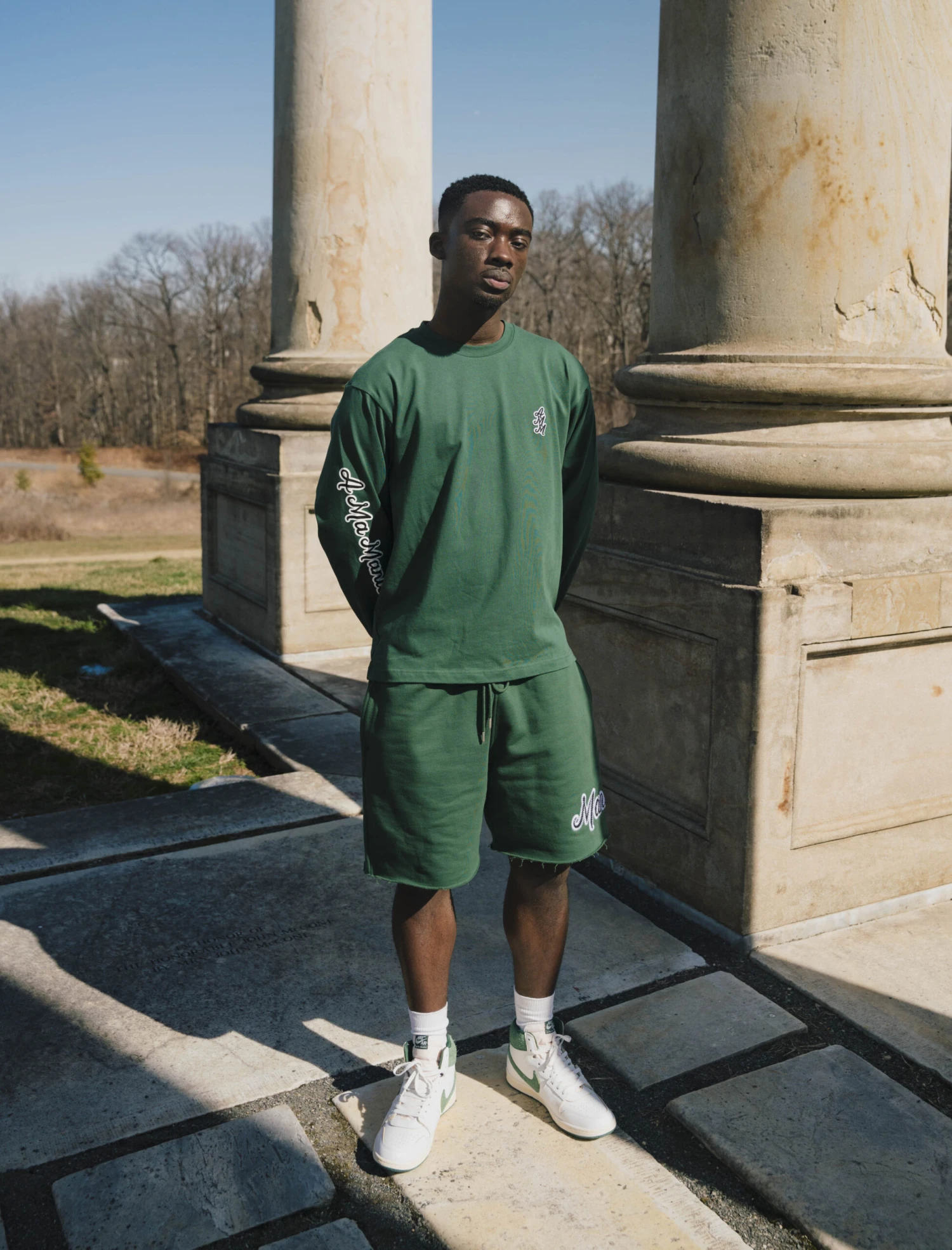 - Graphic logo text at sleeve