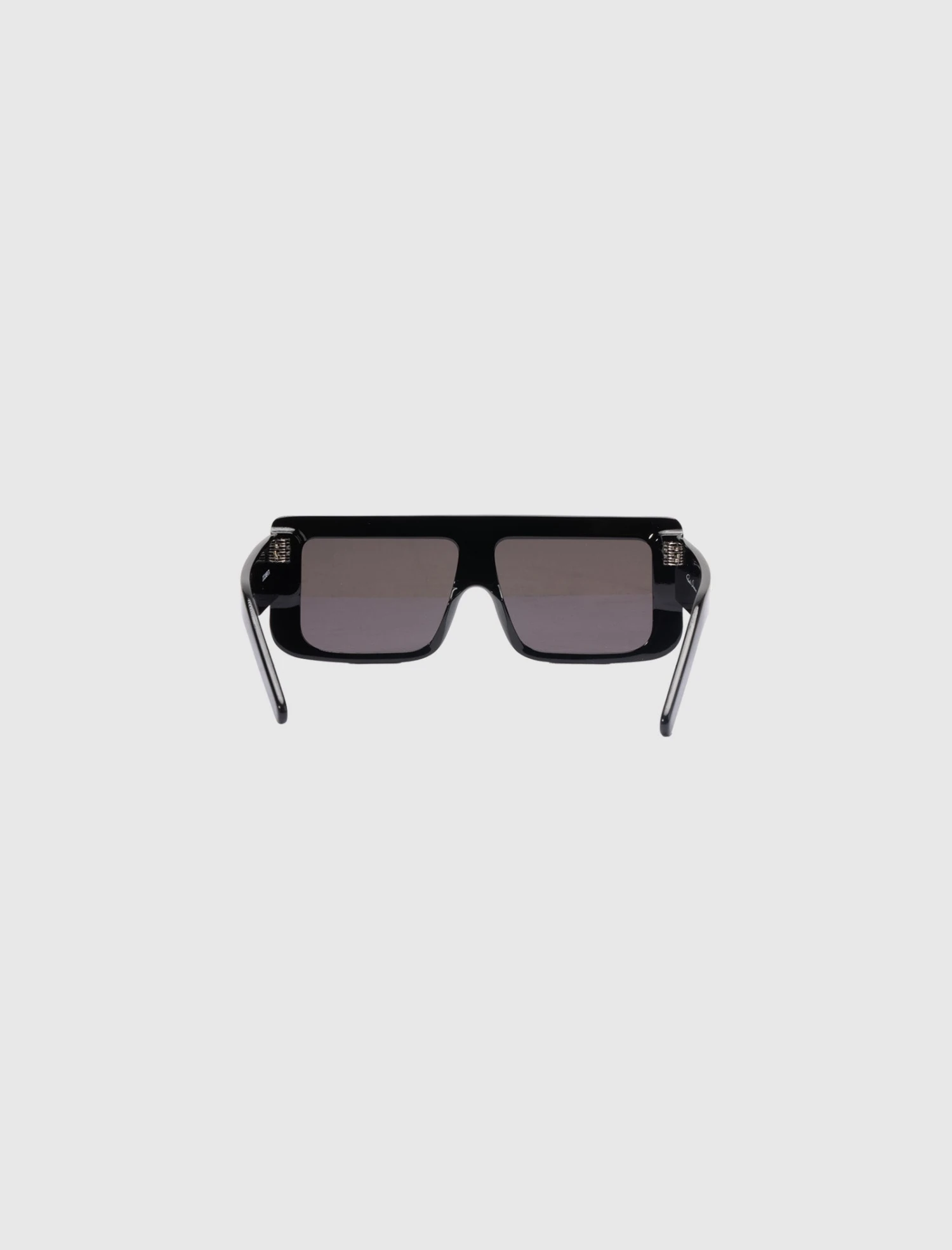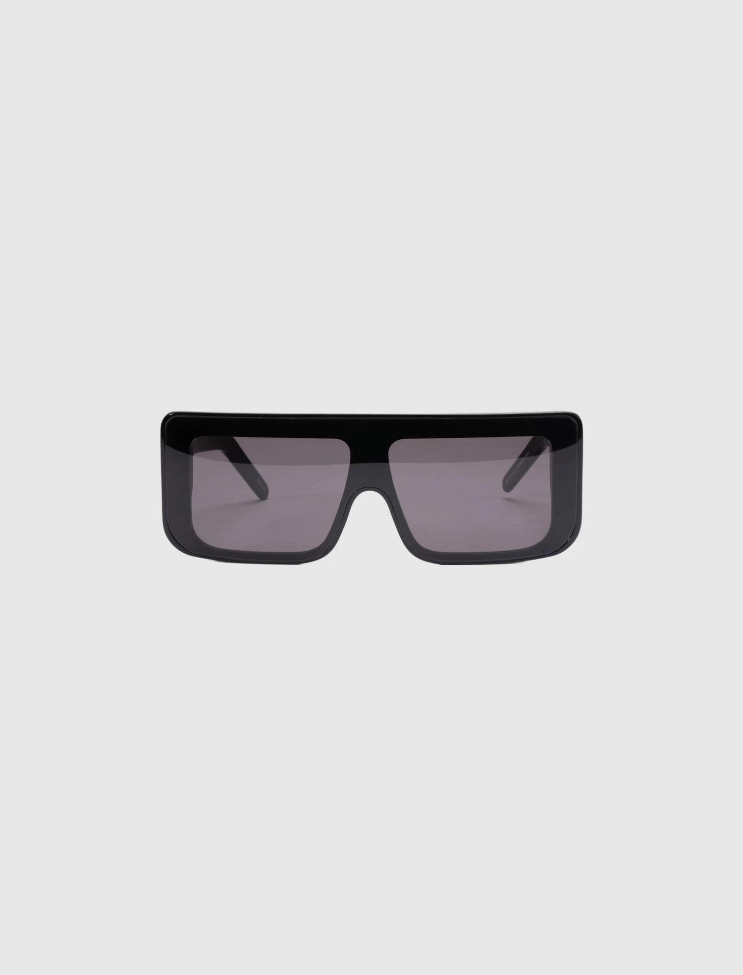 Acetate sunglasses. Thick blocky frame. Wide flat arms. Smoke grey lenses.