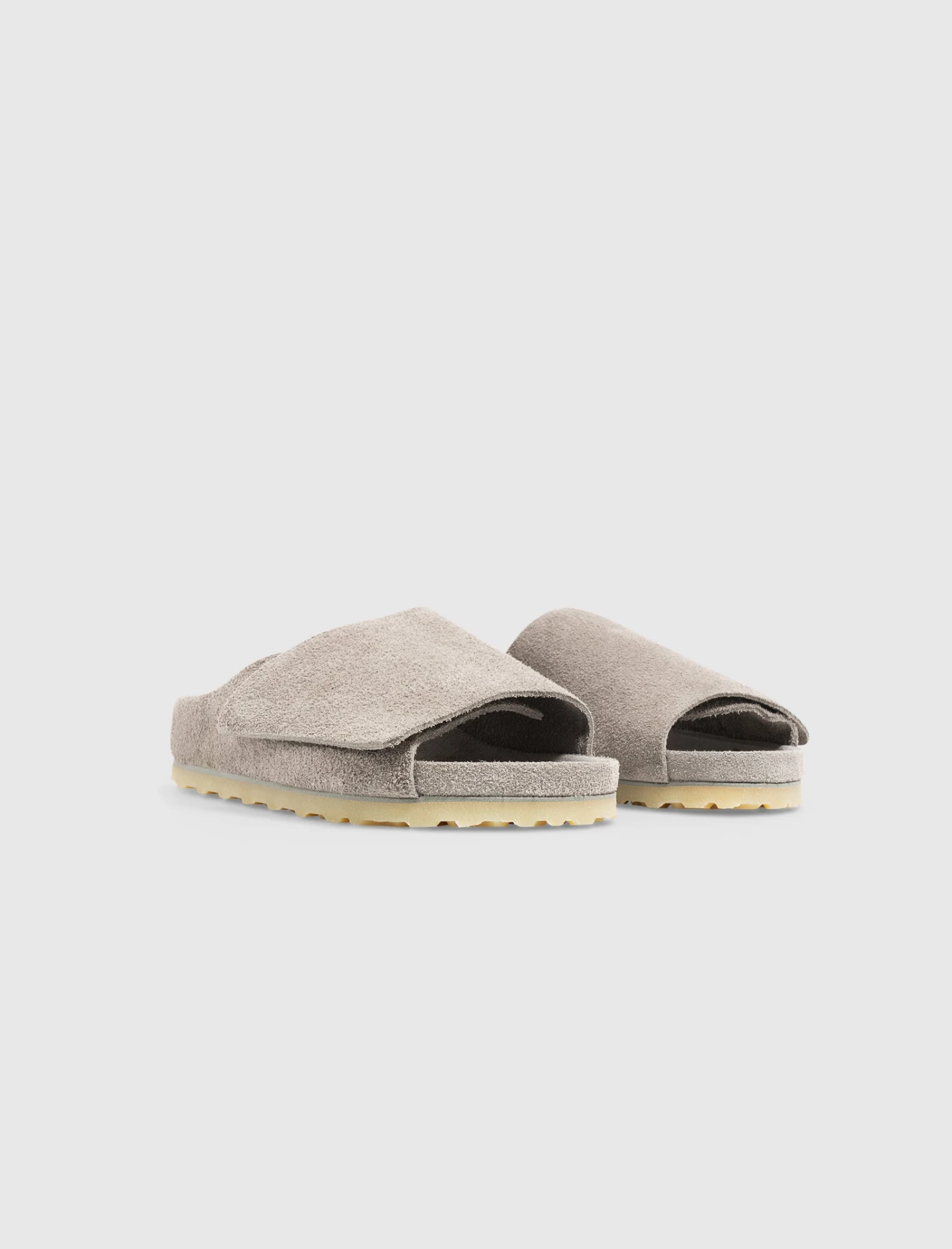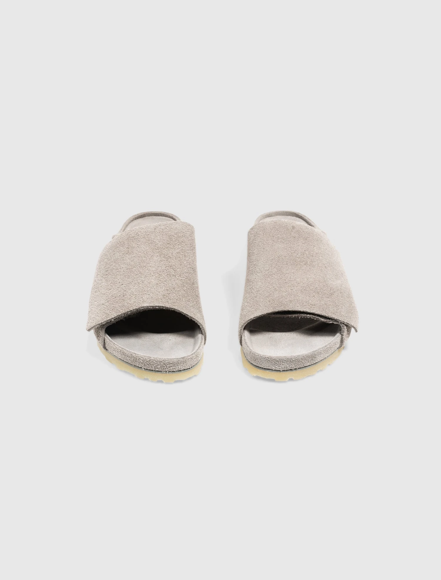 Slip on suede slides. Molded suede footbed. Suede top strap. Translucent rubber outsole.