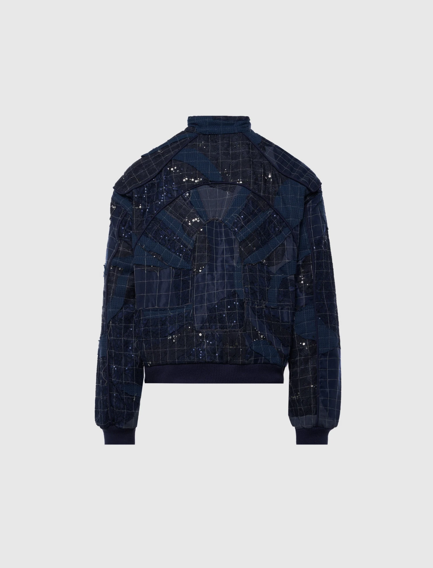 Feel the power and strength of the Who Decides War classic-fit patchwork flight bomber jacket. The mock neck with press-stud fastening adds a touch of sophistication. The combination of canvas, waffle knit, embroidered lace panels with piping, sequin, and loose threads creates a dynamic and unique look.