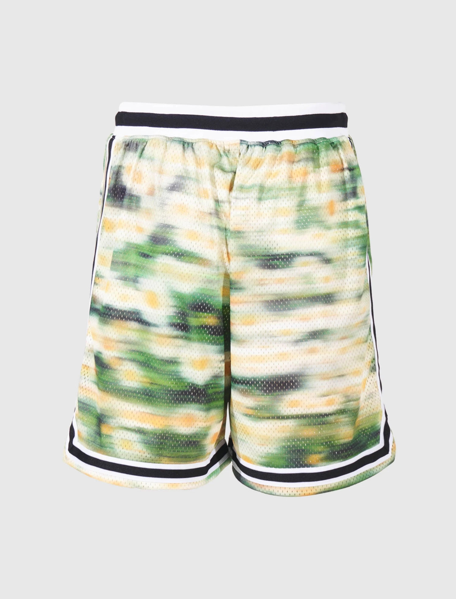 Relaxed-fit mesh shorts. Elasticized drawstring waistband. Two pockets at sides. Graphic print throughout.