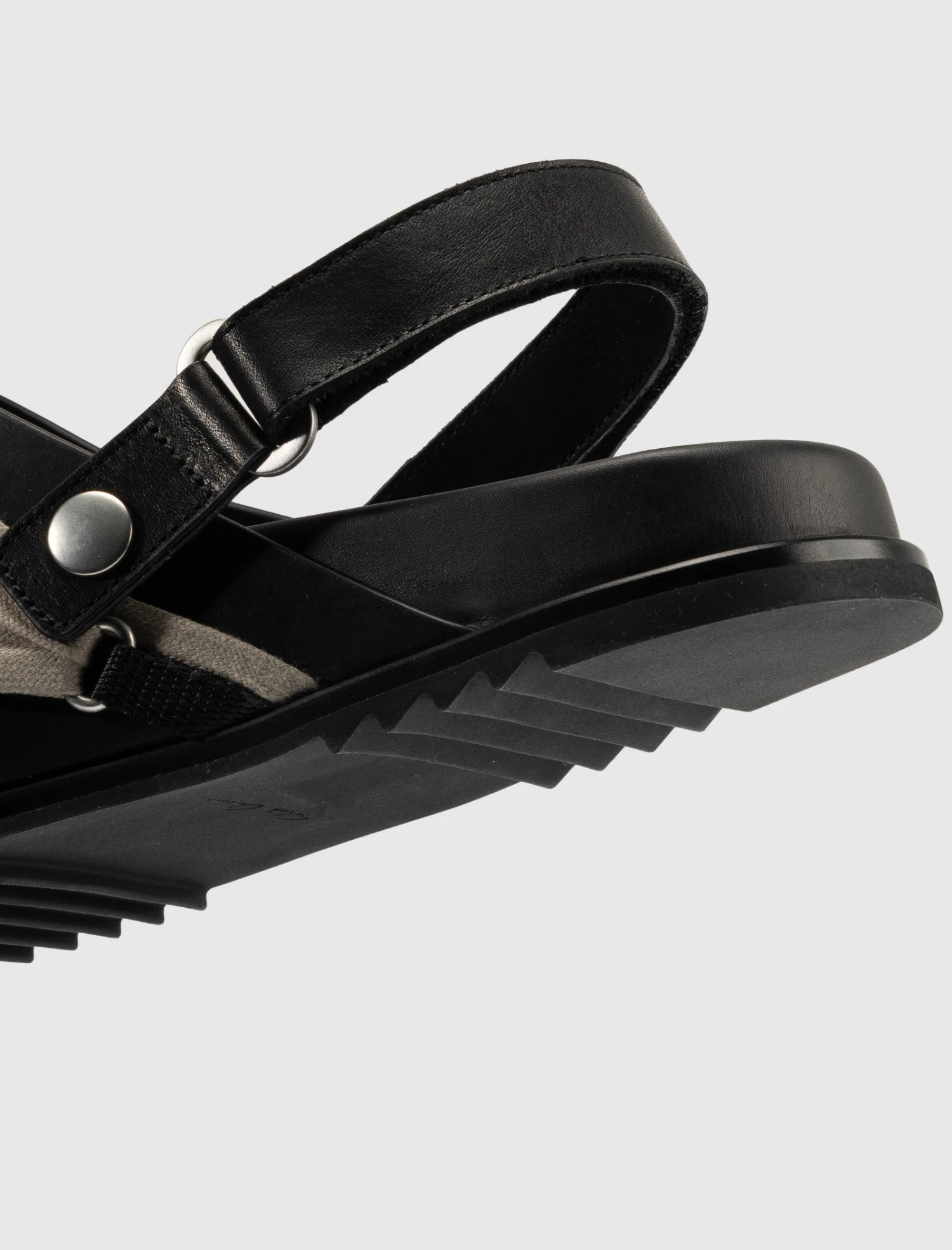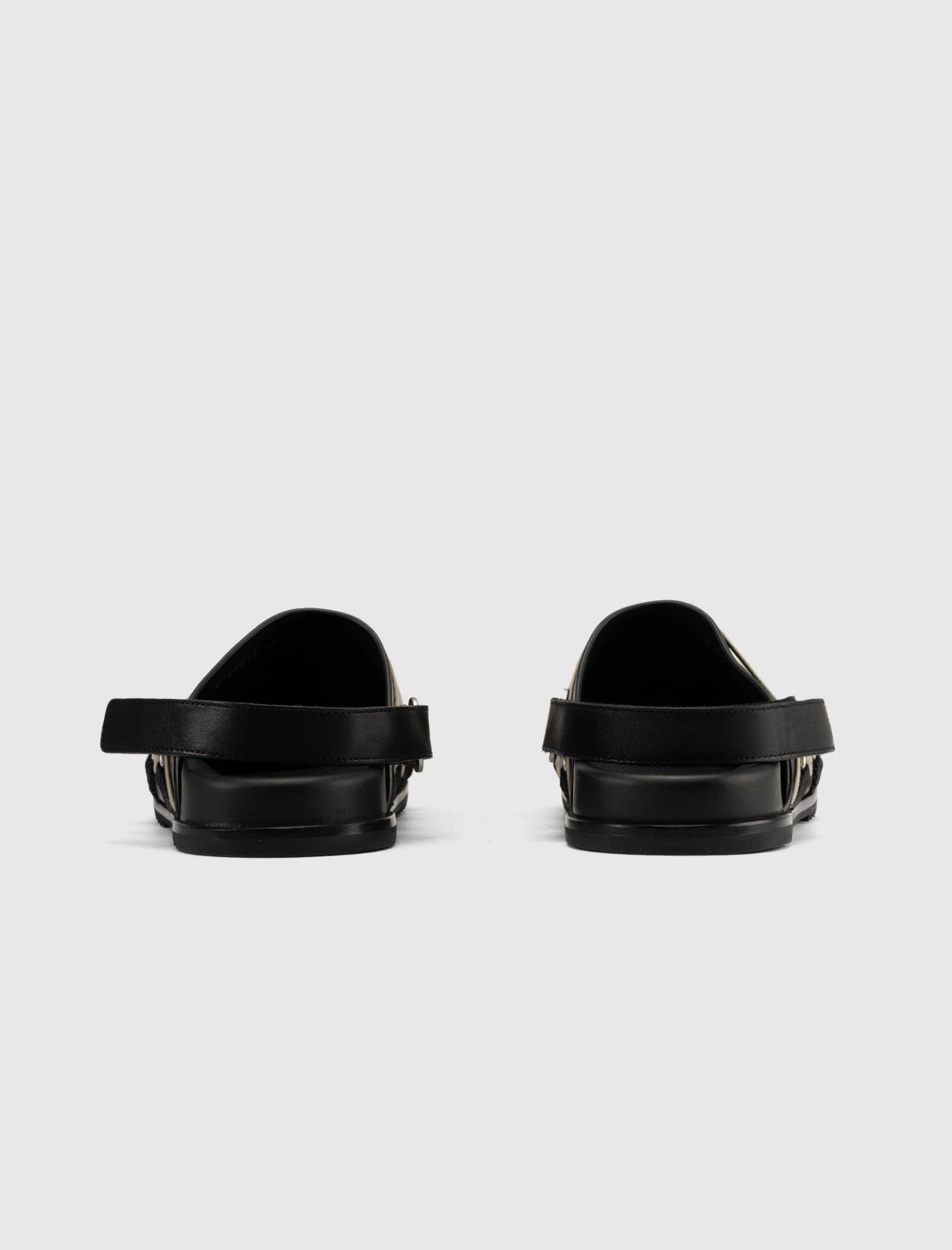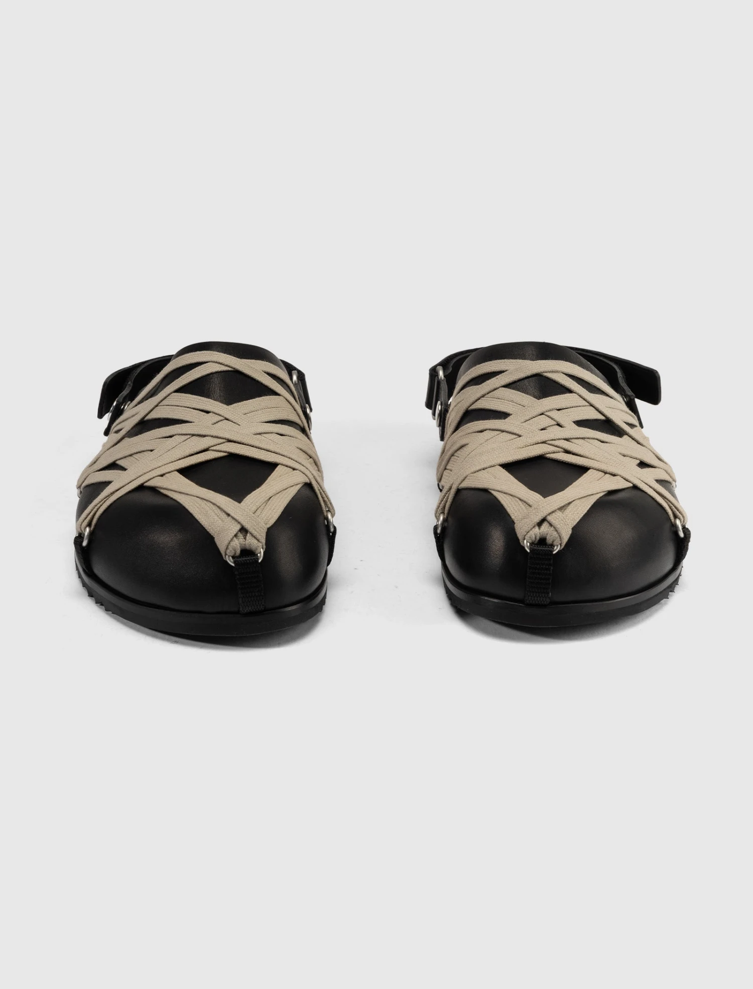 Calfskin leather mule. Megalace layered front lacing. Adjustable leather back strap. Molded footbed. Rubber outsole.