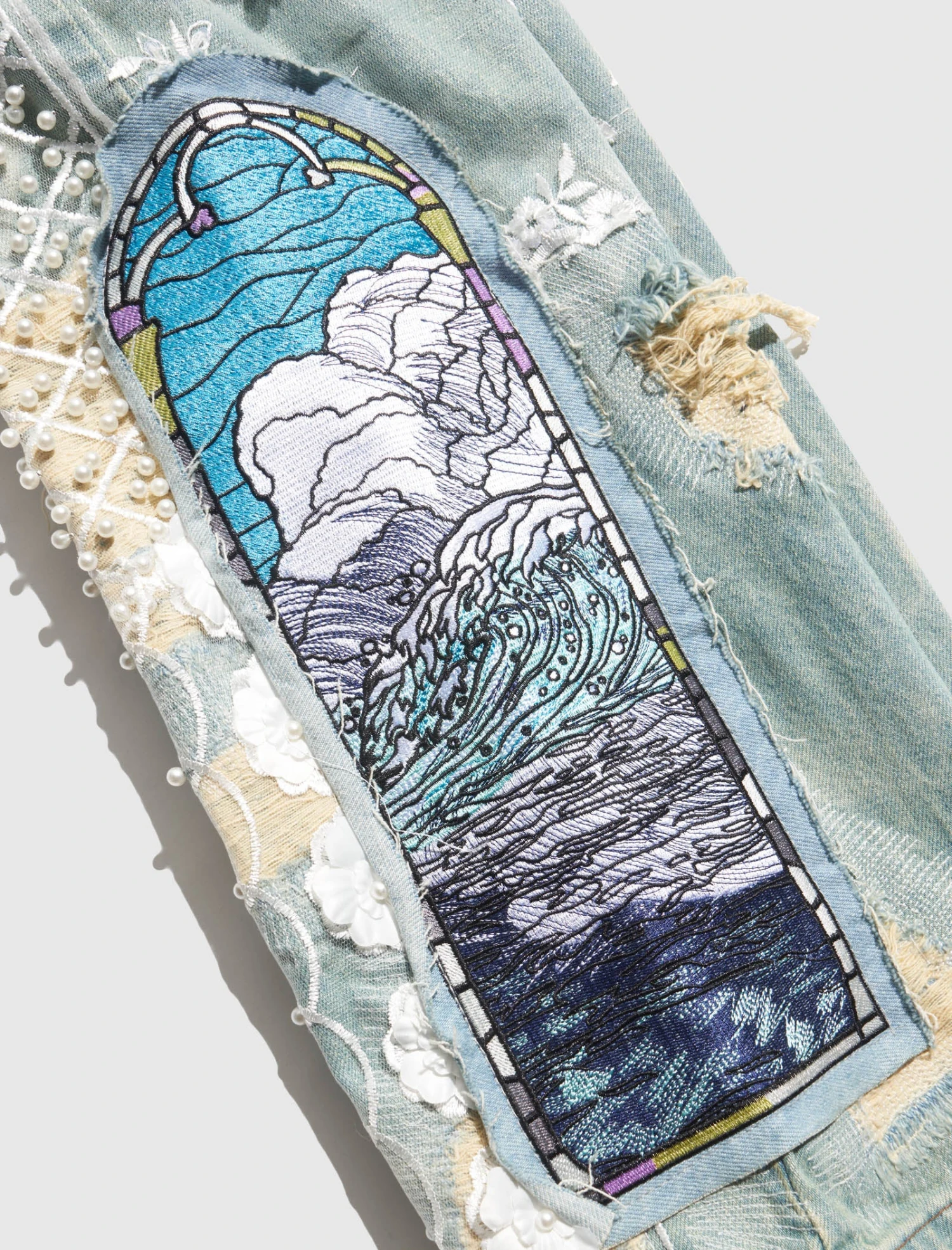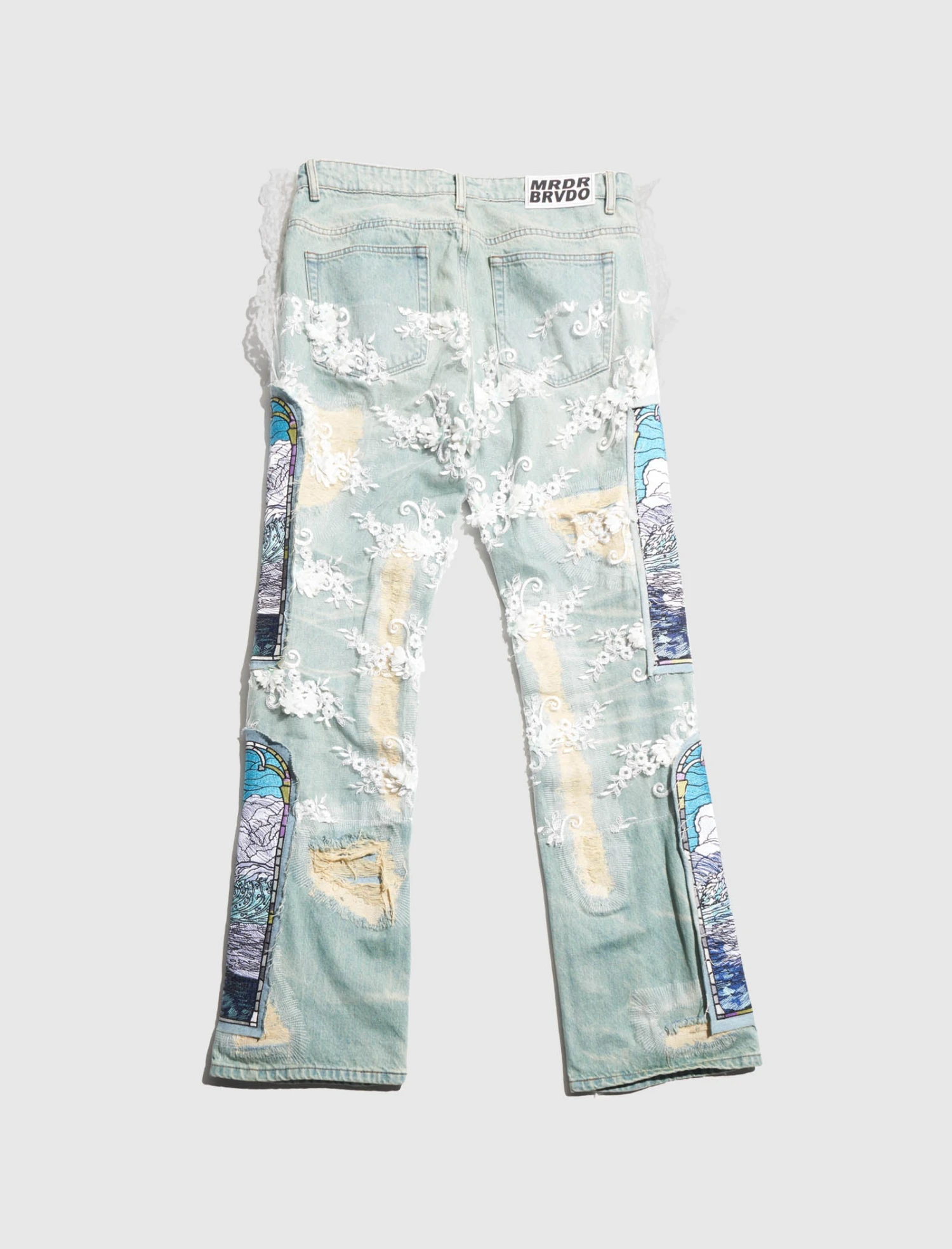Discover the power of Who Decides War straight-leg denim jeans. With five pockets and a floral lace overlay adorned with pearl embellishments, these jeans make a statement. Adorned with graphic patches on the pant legs, these jeans speak to your unique style.