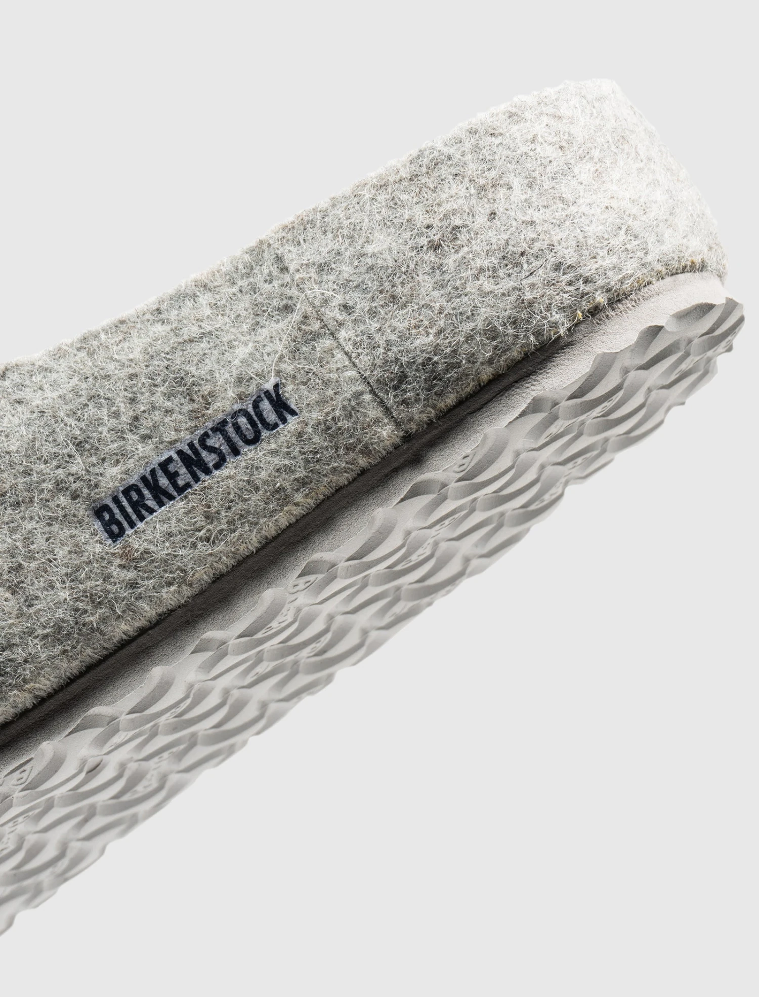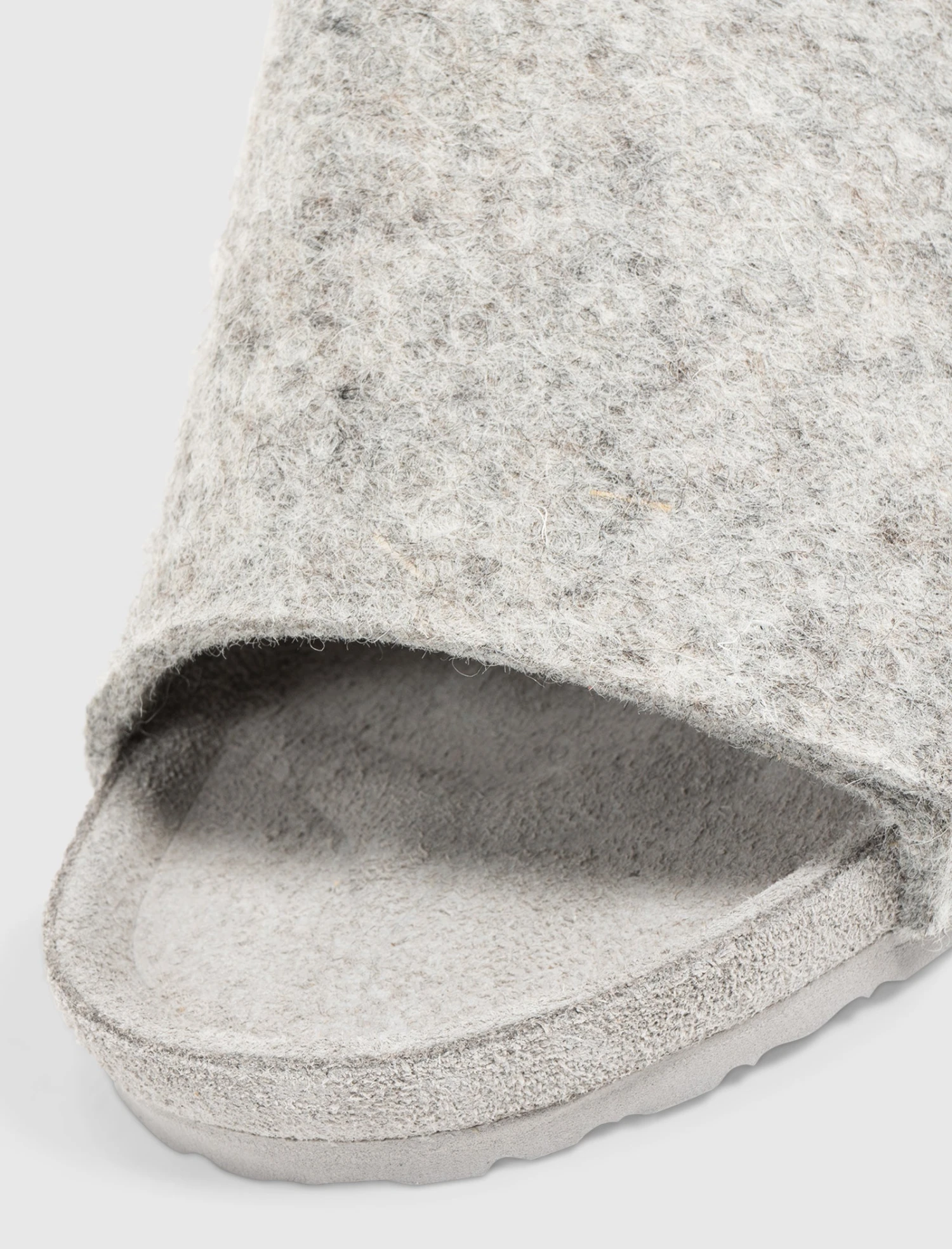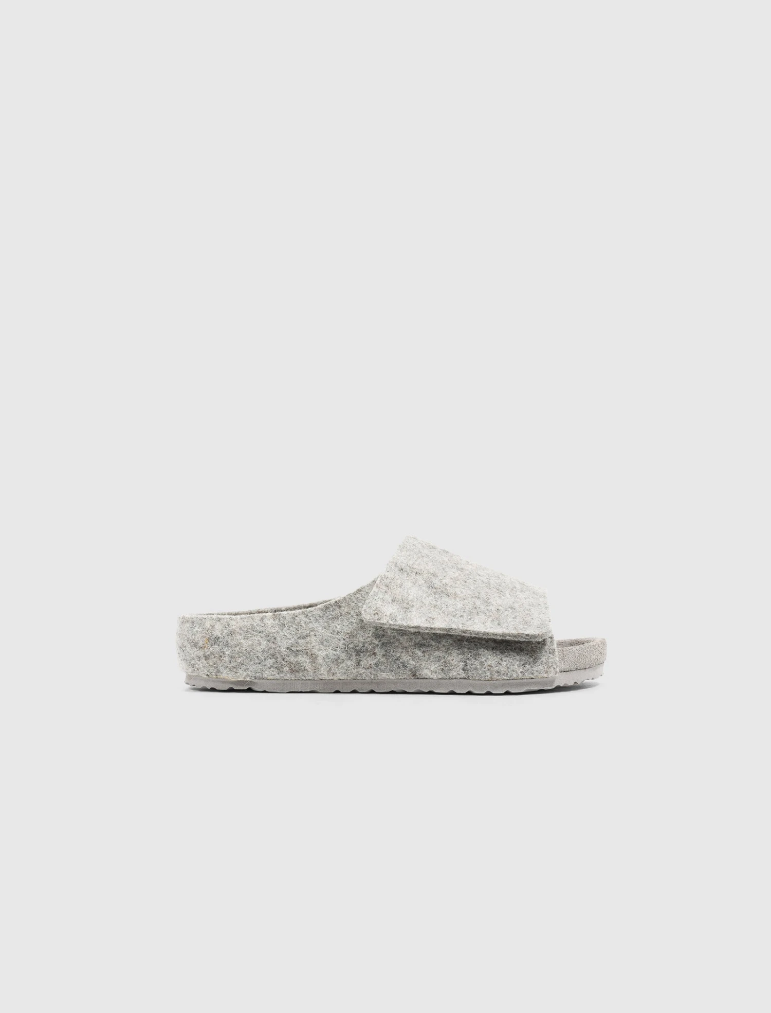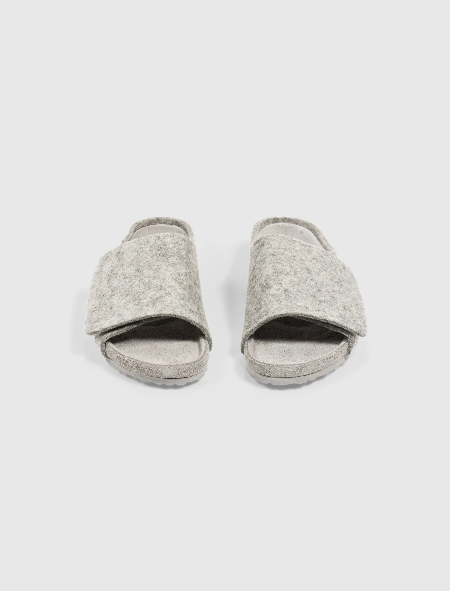 Slip on felted wool slides. Molded suede footbed. Felted wool top strap. Translucent rubber outsole.