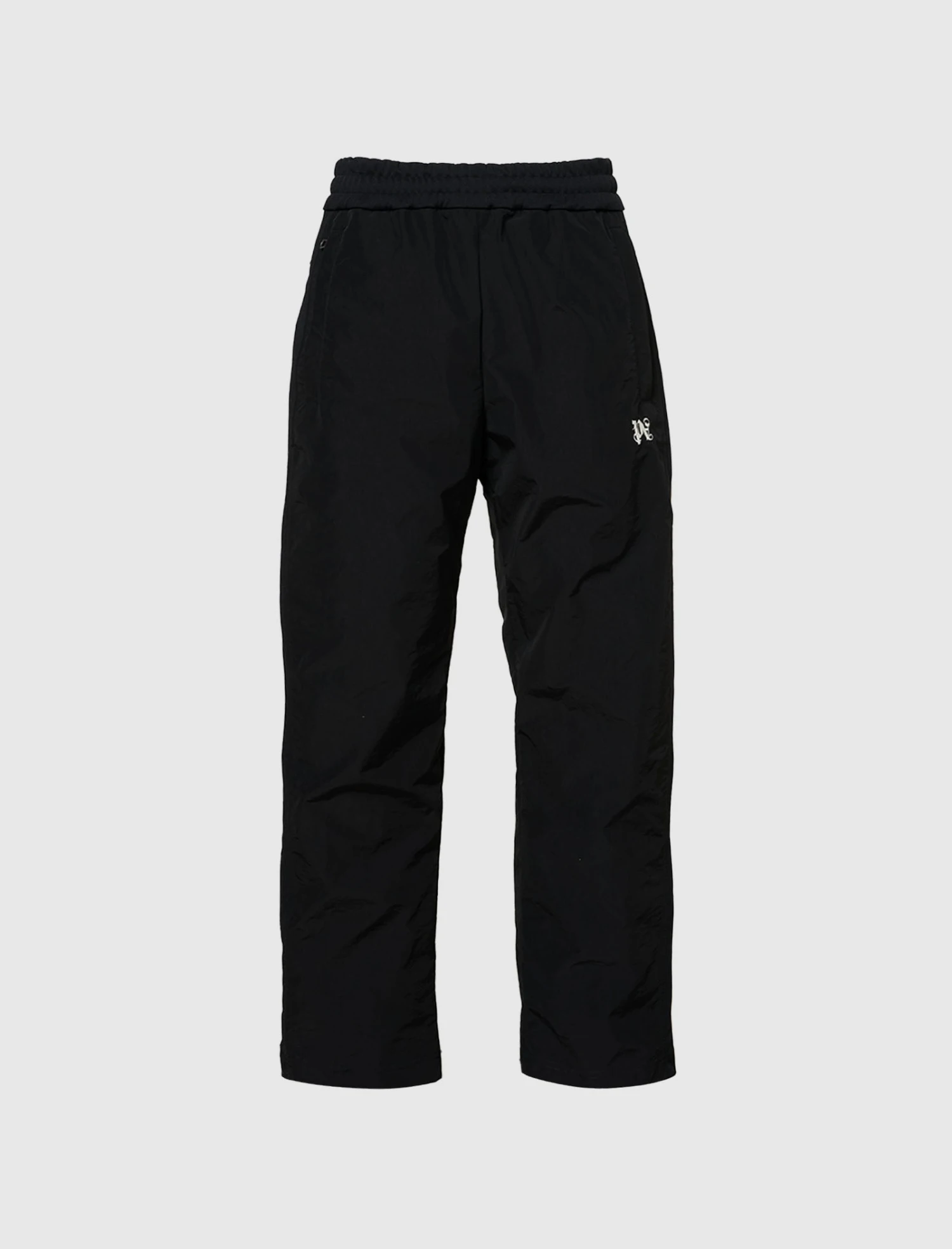 Regular-fit nylon blend track pants. Elasticized drawstring waistband. Two zip pockets at sides. Single snap pocket at back. Embroidered logo at front. Dual stripes at side seams.