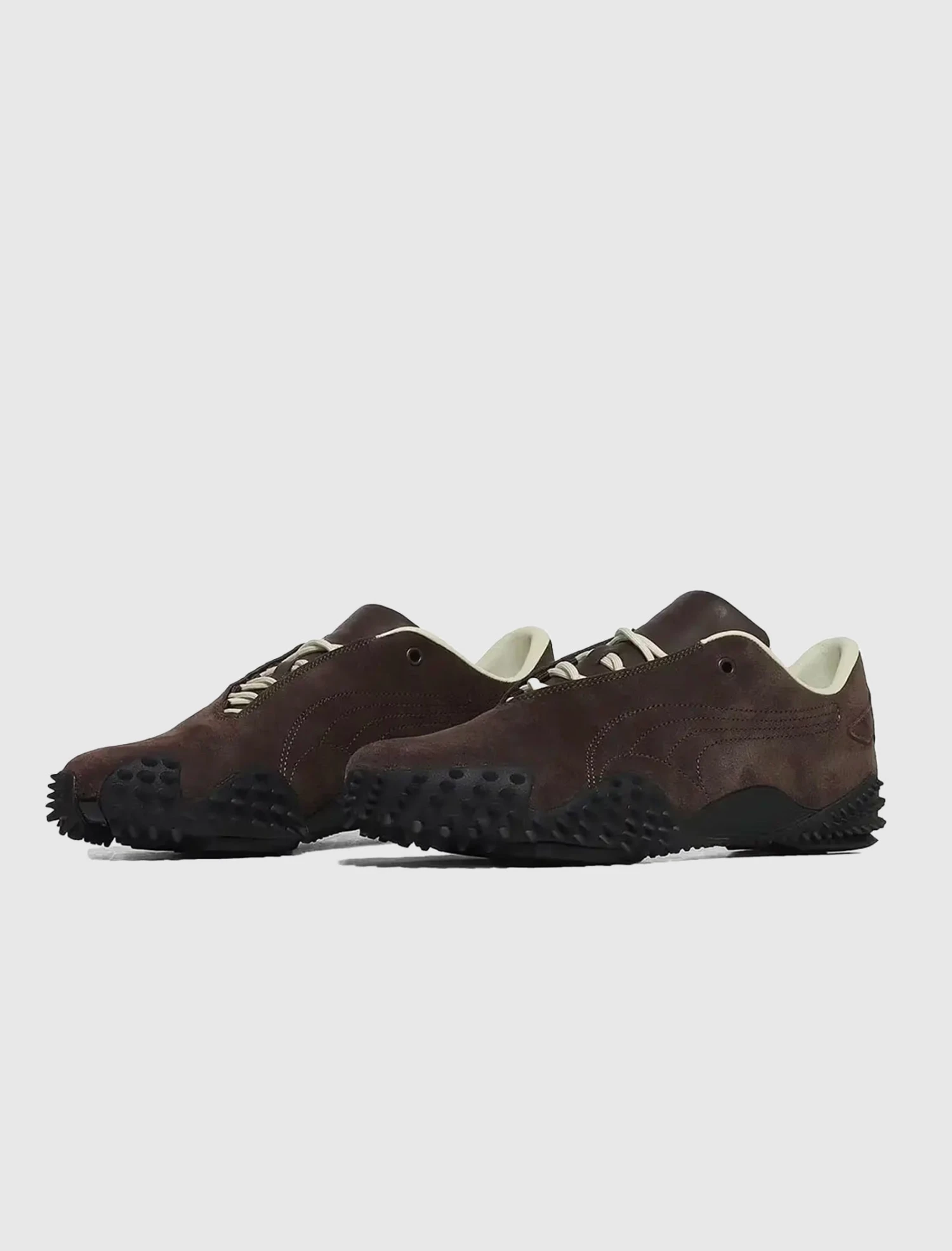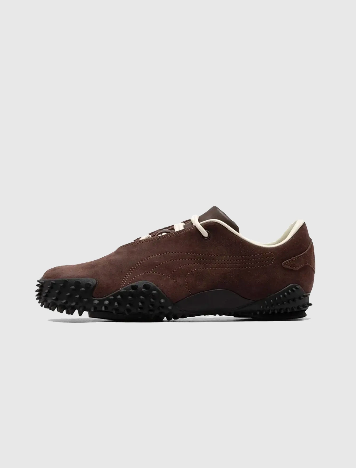 Low top sneakers. Suede upper. Embroidered logo motif patches on the side panels. Suede overlay on the back of the heel counter. Front lacing. Padded leather tongue. Spiked tread rubber outsole.