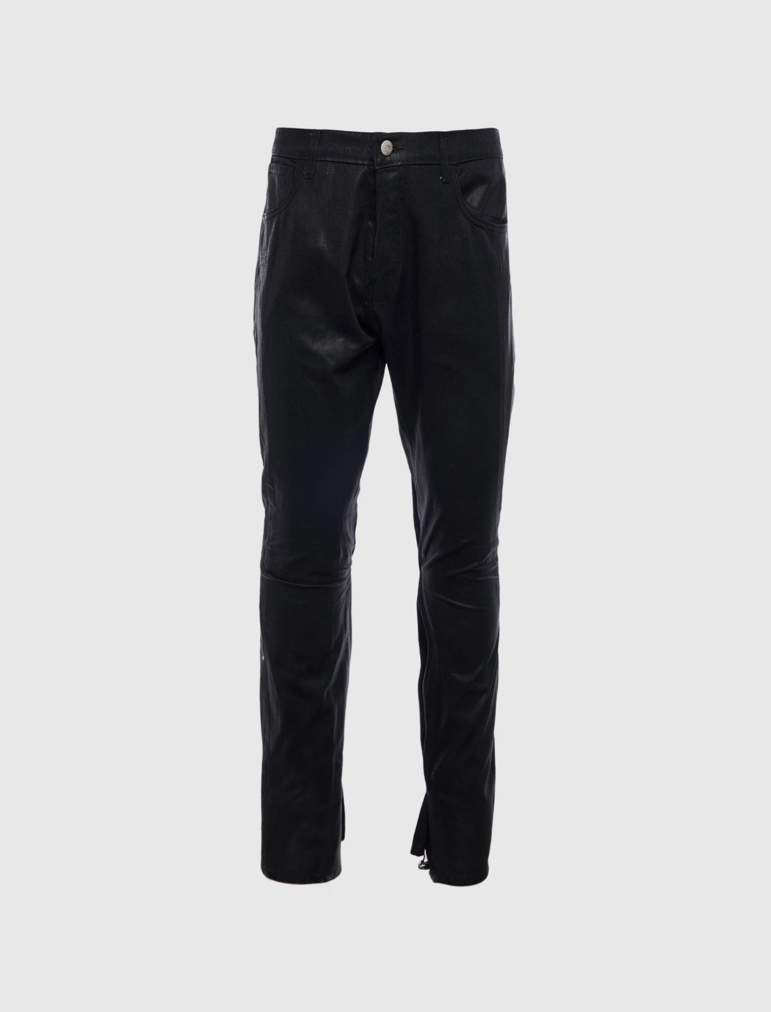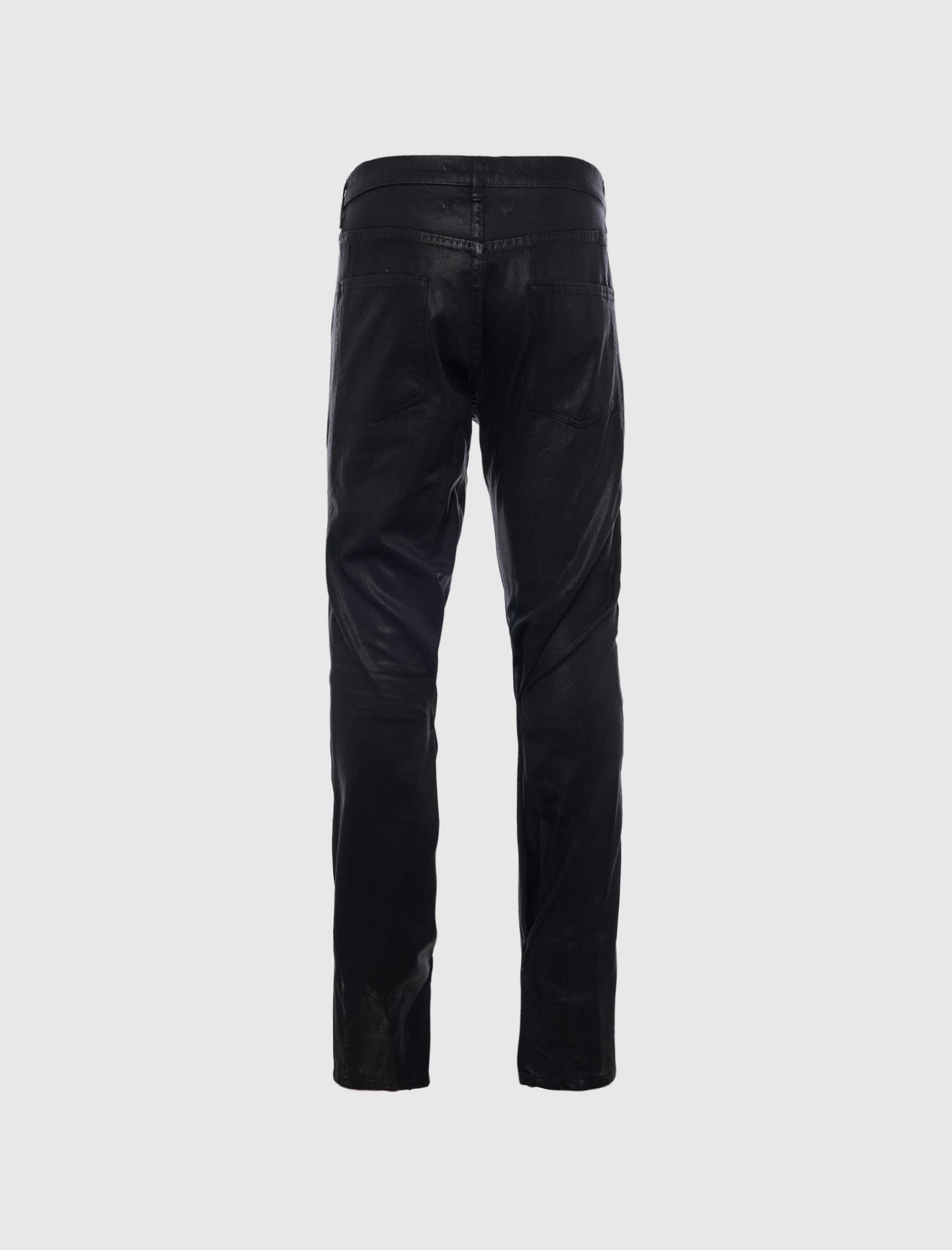 Slim-fit coated cotton straight leg pant. Five pockets. Button fly closure at front.