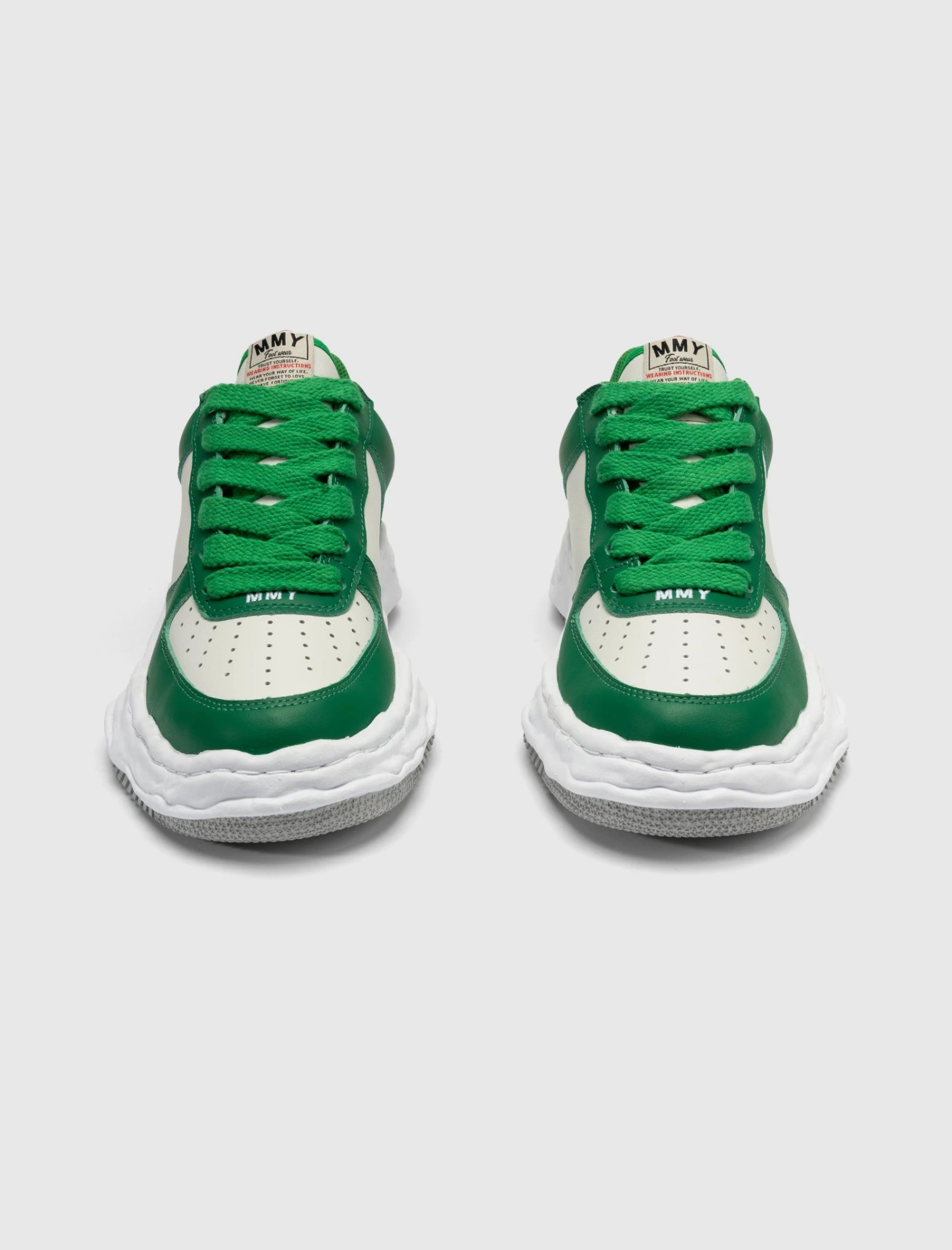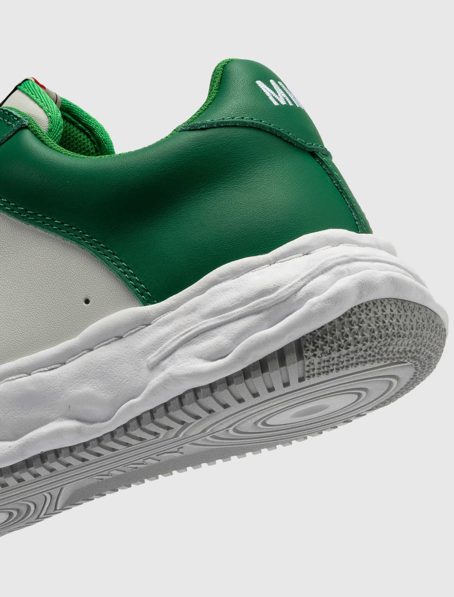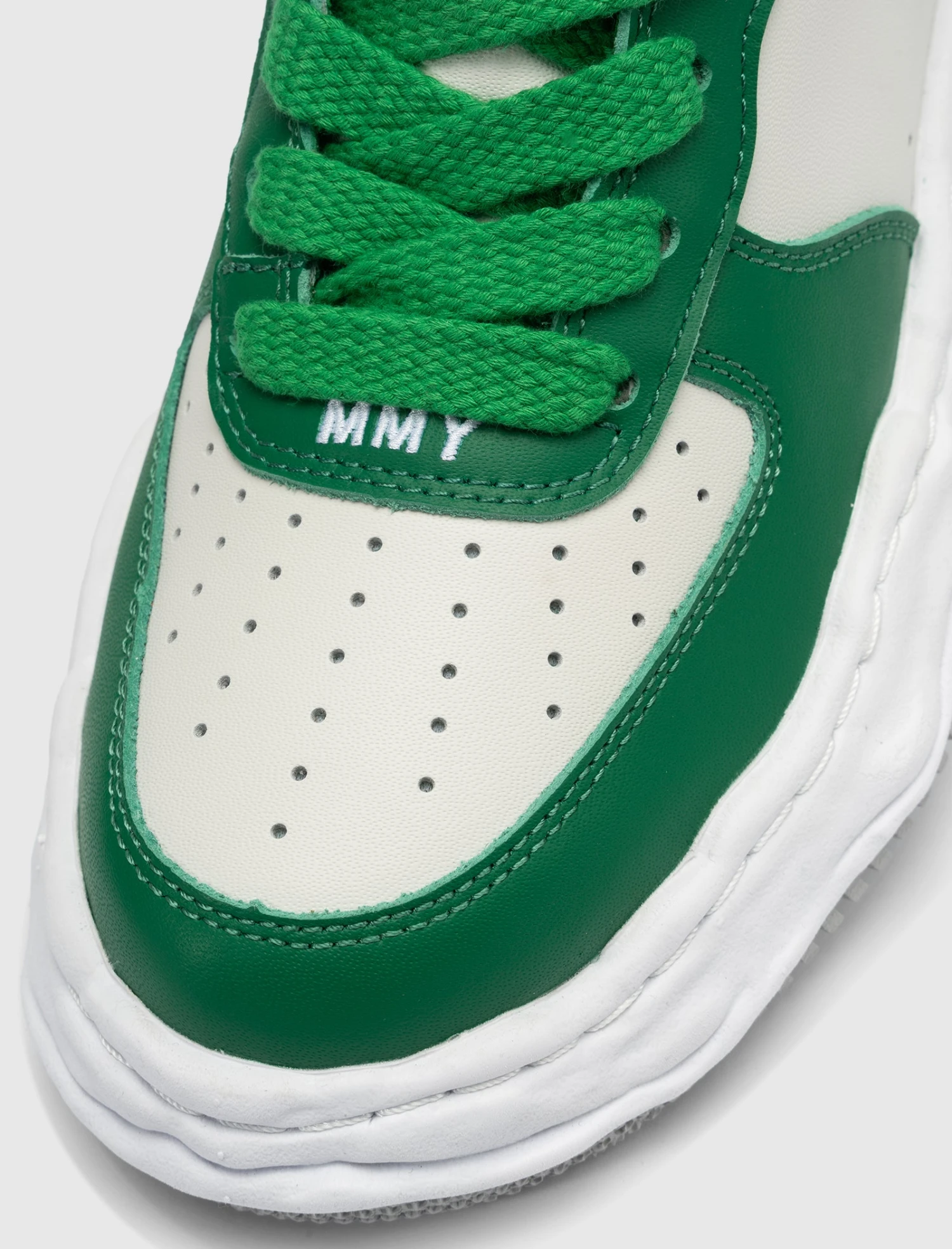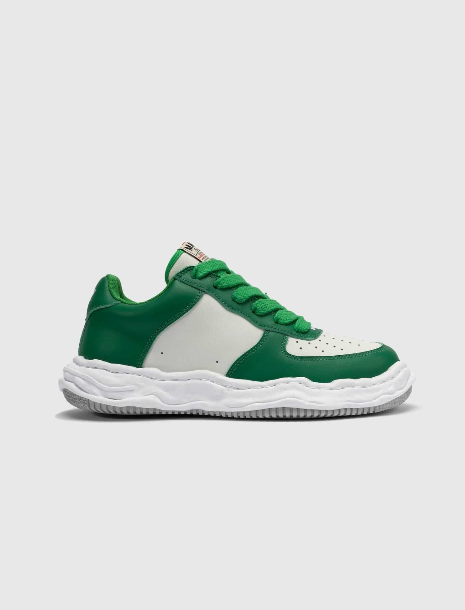 Low top sneakers. Leather overlays around the toe, eyelet panels, and heel counter. Perforated toe box. Leather side panels with ventilation holes. Leather heel tab. Front lacing. Nylon tongue. Textured molded midsole. Flat treaded rubber outsole.