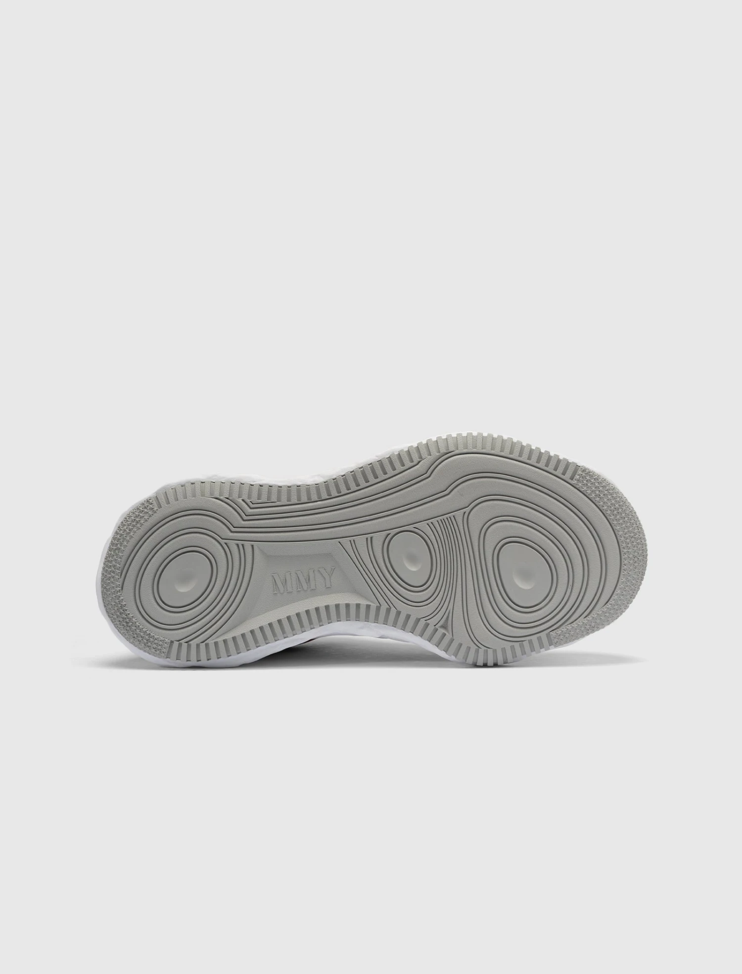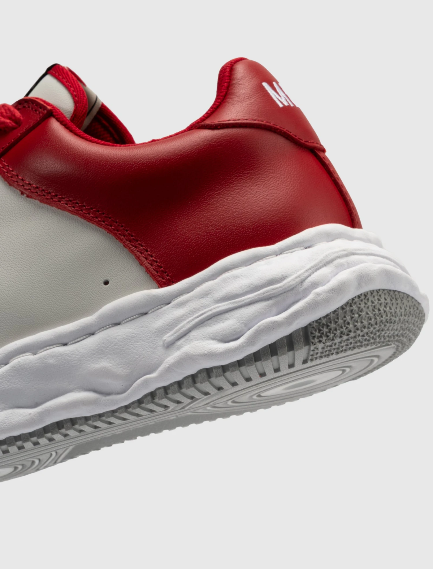 Low top sneakers. Leather overlays around the toe, eyelet panels, and heel counter. Perforated toe box. Leather side panels with ventilation holes. Leather heel tab. Front lacing. Nylon tongue. Textured molded midsole. Flat treaded rubber outsole.